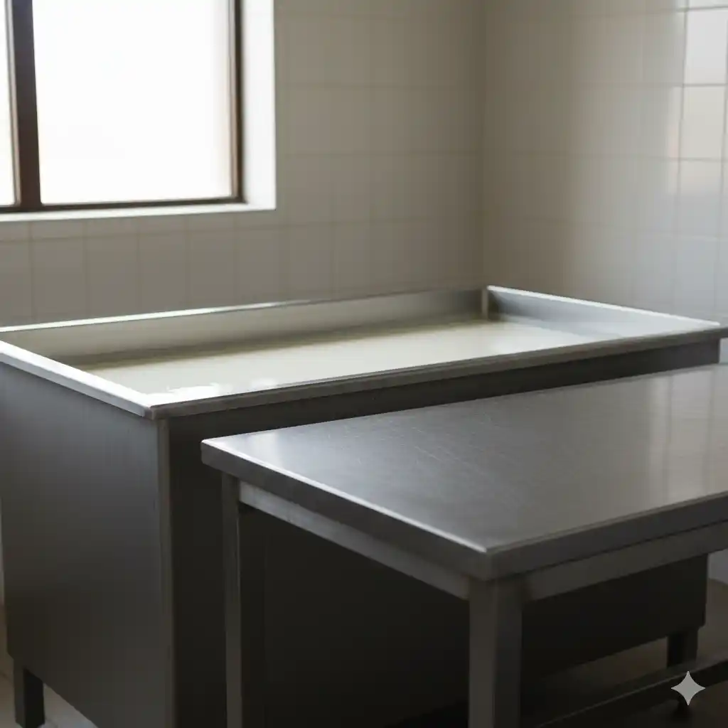 - Mesa de Manipulação: Deve ser inteiramente em aço inox AISI 304, garantindo uma superfície lisa, inerte e de fácil limpeza.